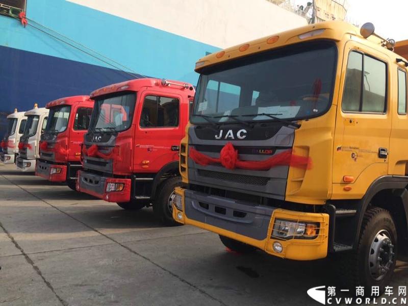2014年11月17日,应委内瑞拉交通部的采购要求,中国重卡出口第一大单——江淮汽车出口委内瑞拉5239辆重卡订单首批200辆在上海海通码头启程发运。图为江淮格尔发重卡。